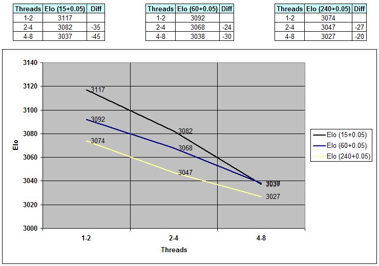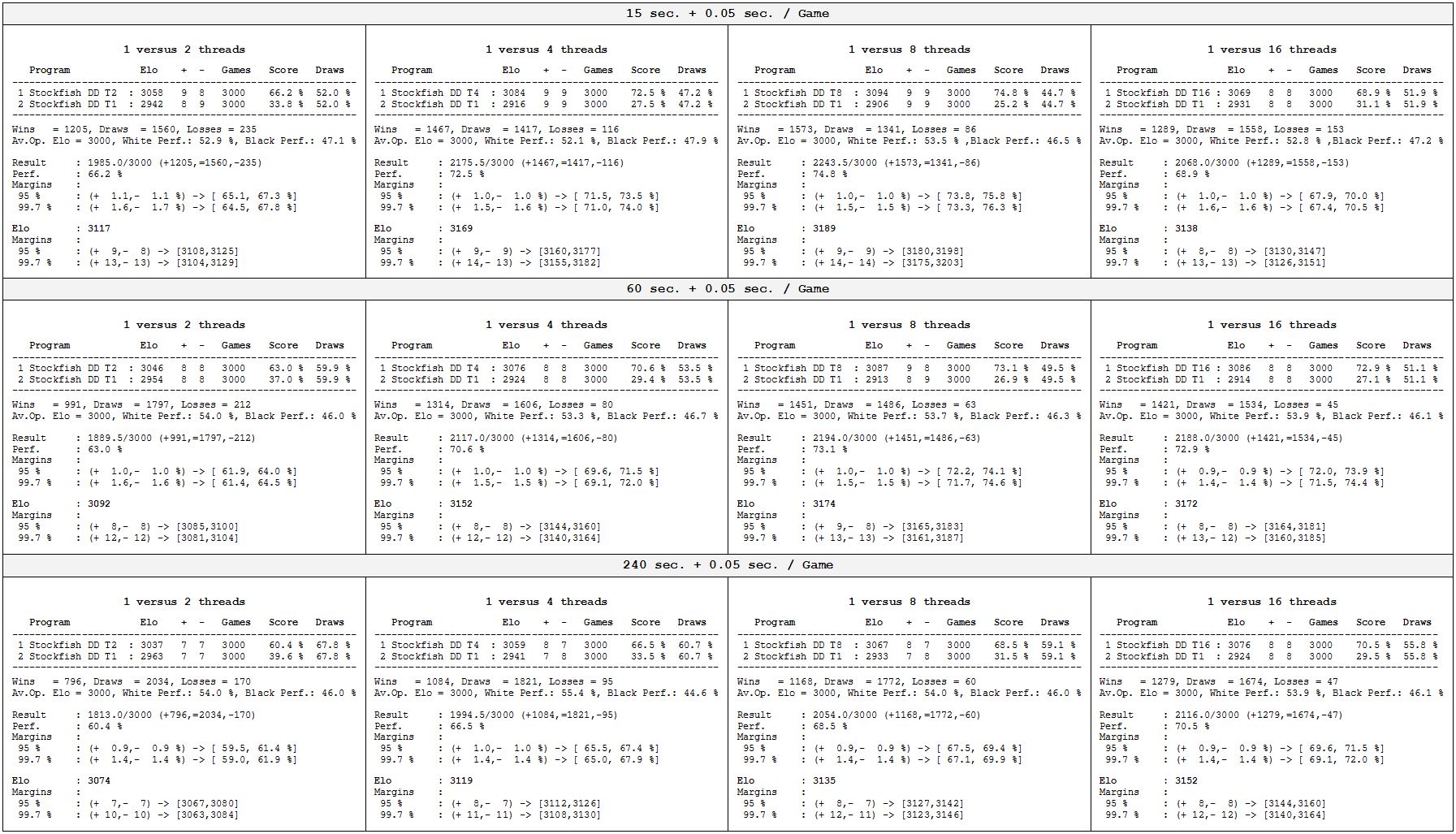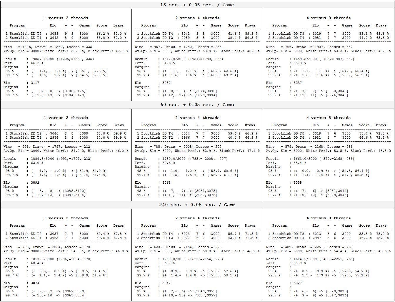 Dual AMD Opteron 6376 (2x 16 Cores) Windows 7 Professional 64-Bit Cutechess-Cli, no draw and resign rules Stockfish DD 64 SSE4.2 128 MB None 15+0.05, 60+0.05, 240+0.05 seconds per game 1500 different opening positions (no book) Changing colors (3000 games per match) Off Off |